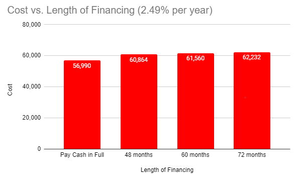 It was an easy decision for financing. I didn’t want to go through a bank. Instead, we went with a local non-profit credit union. No profits means financing costs are less. If you are looking for a credit union, check out your local credit union, Navy Federal Credit Union, and PenFed. The key question was, how many years did we want to finance payments? Fewer years means lower interest costs and higher payments. Longer years means more interest costs and lower payments. The key is your budget. Ultimately, we decided on 5 years. The cost came close to $1000 per month. Shocker and major ouch!