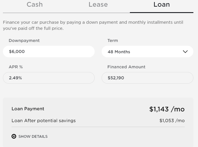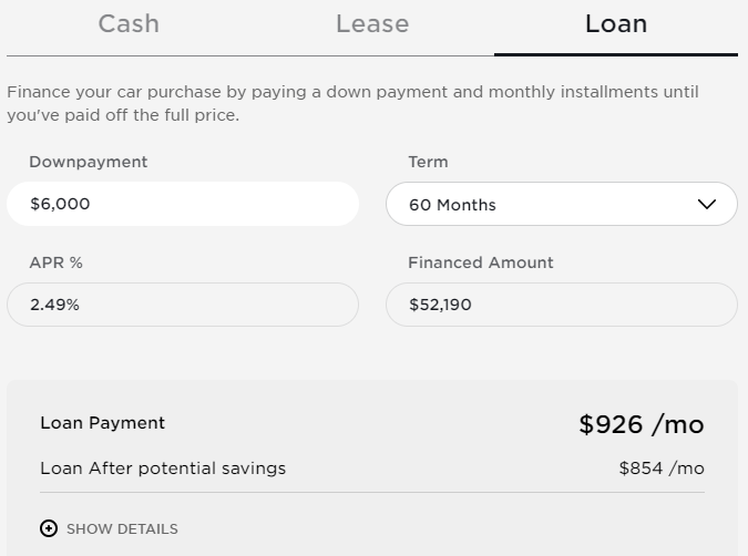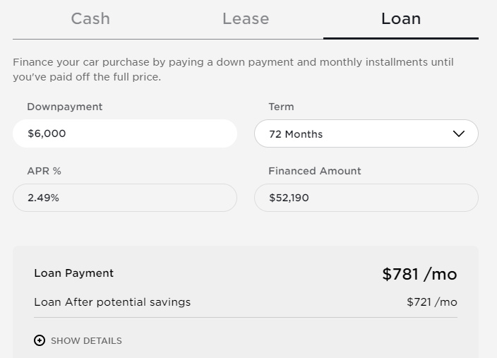 From Tesla’s US site, here is the expected financing cost for 48 months, 60 months, and 72 months.