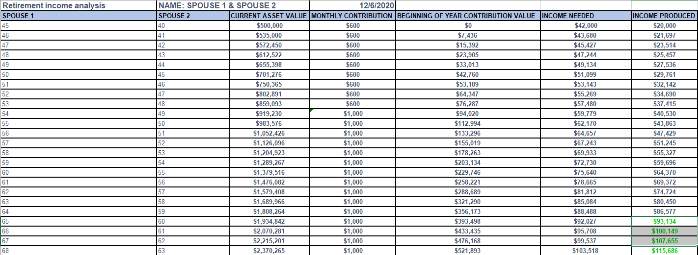Based on their assumptions, we can see the income they are able to generate exceeds the inflation adjusted income they needed when Spouse 1 turns 65 and Spouse 2 turns 60. There are a number of ways they can retire sooner. They can save more money every month, earn a higher rate of return, presume a lower rate of inflation, shift more money to investments, or have a higher lifetime income rate. If Social Security kicked in at 70, that will allow them to spend more on income at younger ages, knowing Social Security can make up the difference. You could even say they could retire at age 64 /59, since they are only $2000 apart in what income they needed and what income they could produce.