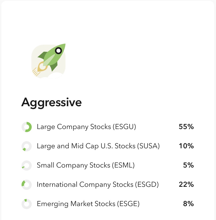 ESGU is up 11.2%, SUSA is up 12.6%, ESML is up 16.0%, ESGD is up 9.35%, and ESGE is up 3.9%. That gives us an overall return of 9.8% year to date for Sustainable Aggressive, which is great. I’ll keep a close eye if this portfolio can close the gap and exceed the Core Aggressive over time.