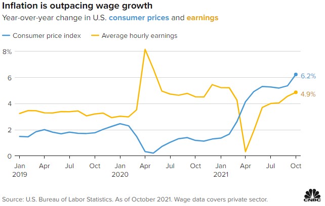 Inflation has been on a tear in 2021. High rates of inflation hurts retirees and working people. Sources of high inflation include pandemic cash payments, easy monetary conditions by the Fed, supply chain shortages, housing shortages, and people switching to better jobs during the pandemic. The end result is higher food, gas, electricity, healthcare, housing and rental costs, and used car prices. Here’s a chart from the Bureau of Labor Statistics and CNBC. We don’t have the latest info, but we see prices overtaking earnings for the first time in more than 3 years.