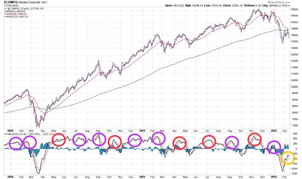 We can apply the opposite logic of buying using the MACD. Sell when the black line is far above zero and the black lines crosses below the red. In most cases, we make money. We do this at the expense of frequent trading and greater time devoted to buying and selling. That’s not fun. That’s stressful. We want to trade less and make more money. If we look back at the daily chart of the Nasdaq, from the beginning of 2020 to present, we see many times where the black line dips below the red line and quickly reverses.