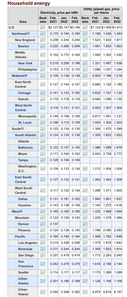 Above we see the rate changes for electricity and unnatural gas across the US. In the South, average electricity prices have increased by 10.6% year over year. Unnatural gas gone up 22.1% year over year. Our electricity prices have gone up 25% and unnatural gas prices are up 62% over the past year, far above average. All hail the broken Texas power grid!