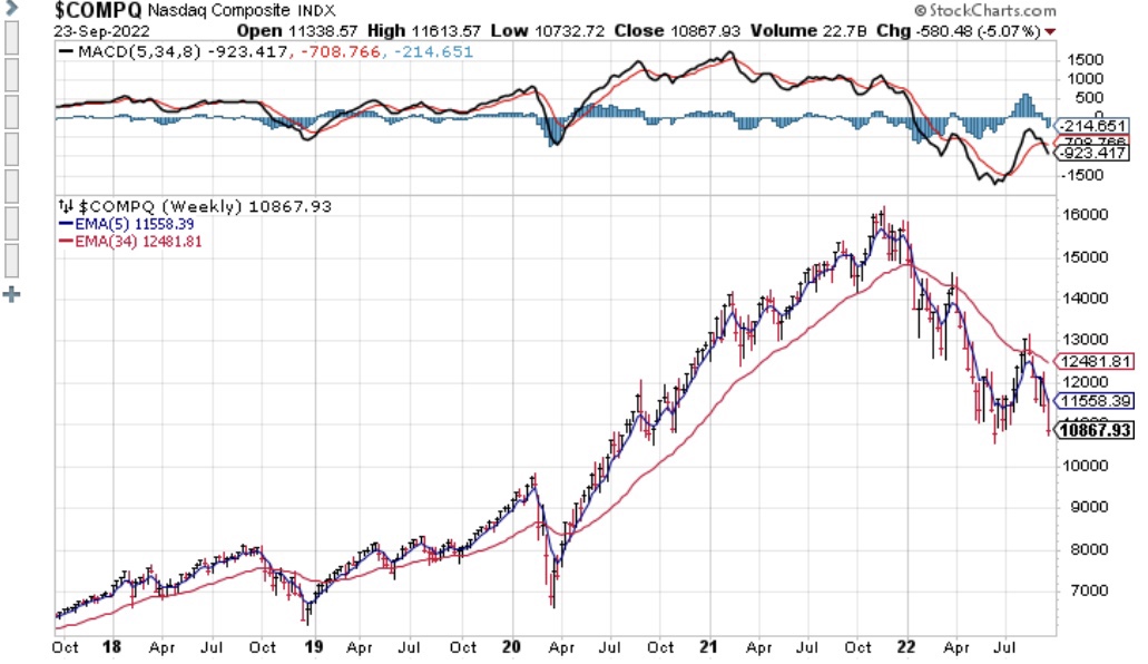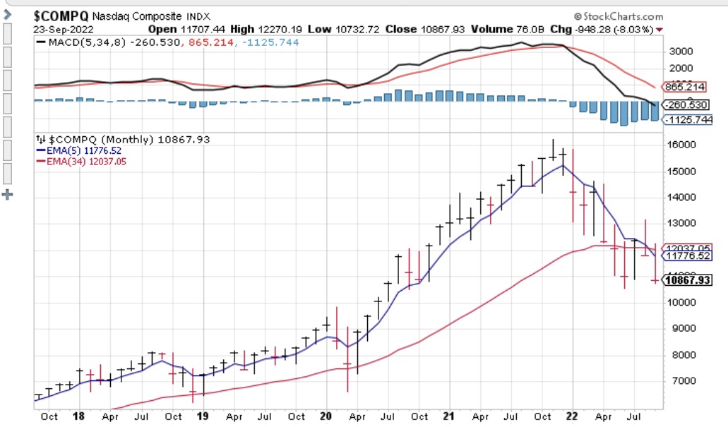 Stock investors got sucker punched in the gut. Emotions are running high as the Fed raises rates to deal with structural inflation due to Covid, war, and climate change. In our previous series, I introduced a chart indicator that might help us avoid the highs and lows of stocks, and reduce our emotions. This was called the Moving Average Convergence Divergence indicator. To eliminate some of the emotions involved, we would use monthly and weekly charts. To keep it simple, black goes above red, buy, and black goes below red, sell.