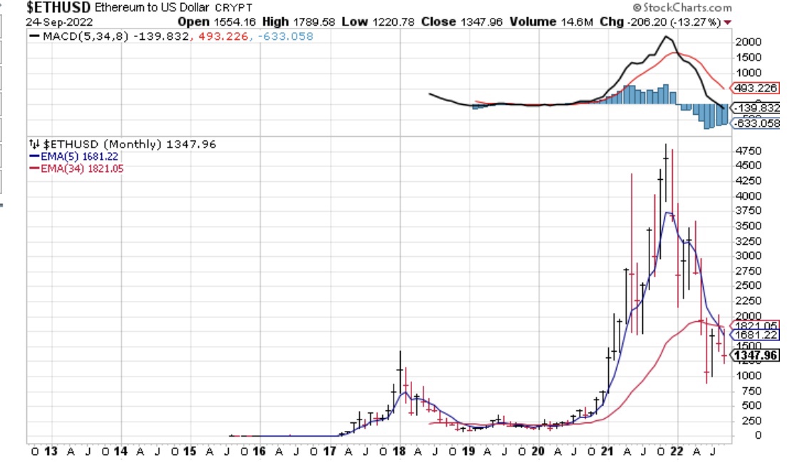 Ethereum peaked at 4750 last year and collapsed to 1350, good for a loss of more than -70%.