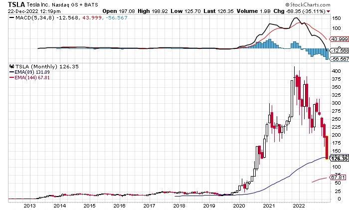 In a harsh December for Tesla, Tesla is down to $125 in price and $396 billion in market cap on 12/22. Exxon is at $433 billion. If Tesla strongly violated the 89 month moving average and stays below, the target is $67. That’s not a typo.