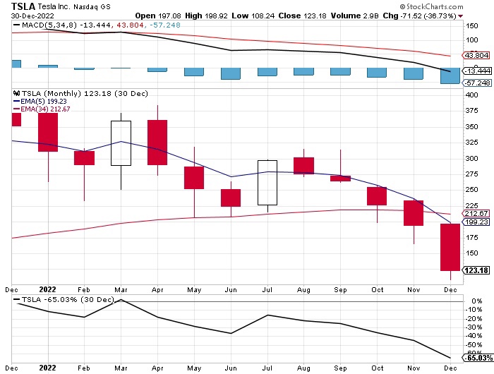 Tesla’s -65.02% loss last year meant the stock lost almost 2/3’s of its value in one year. The valuation bubble has burst. The loss continued on 1/3/2023.