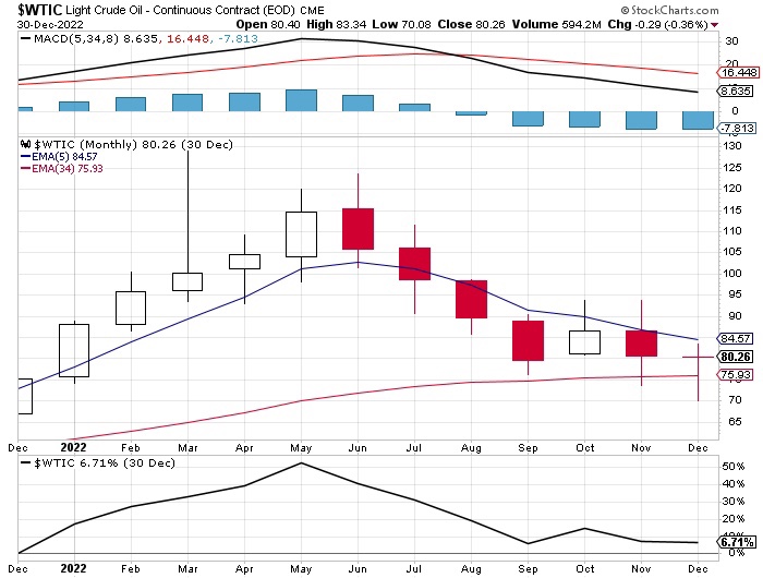 Oil prices went up strongly with Putin’s war but peaked mid-year with a sell signal. Prices were up +6.71% in 2022.