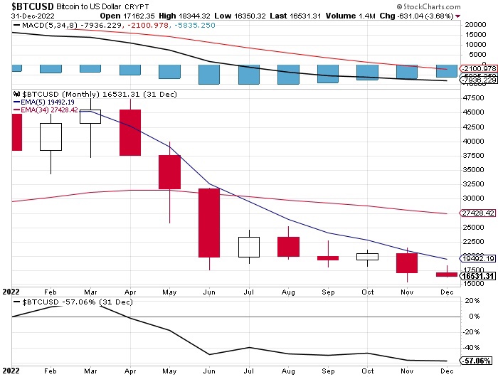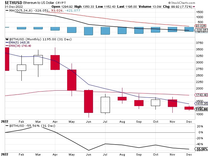 Energy sucking Bitcoin’s chart was a disaster, as was crypto in general. Higher rates and key bankruptcies/ frauds burst the crypto bubble. Bitcoin was down -57.06% for 2022.