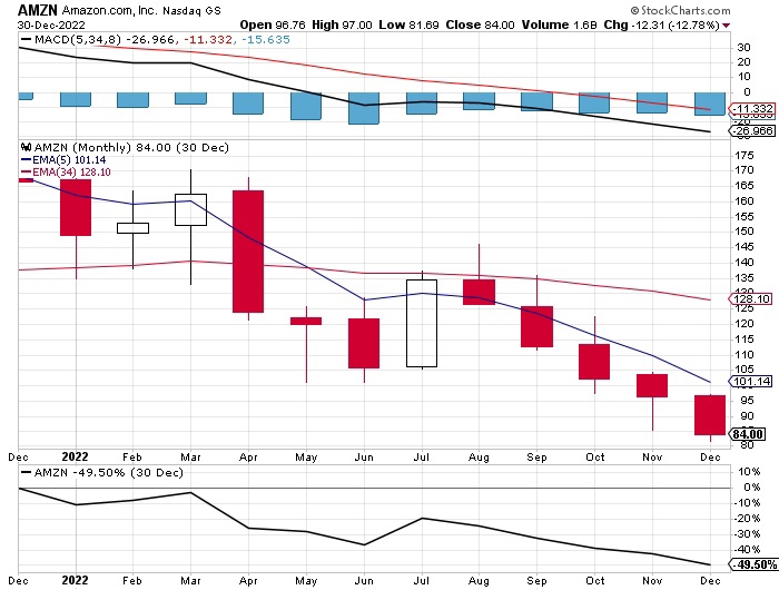 The tech heavy Nasdaq lost almost 1/3 in 2022. No monthly buy signal. Stocks like Apple and Amazon lost $800 billion each in market cap.