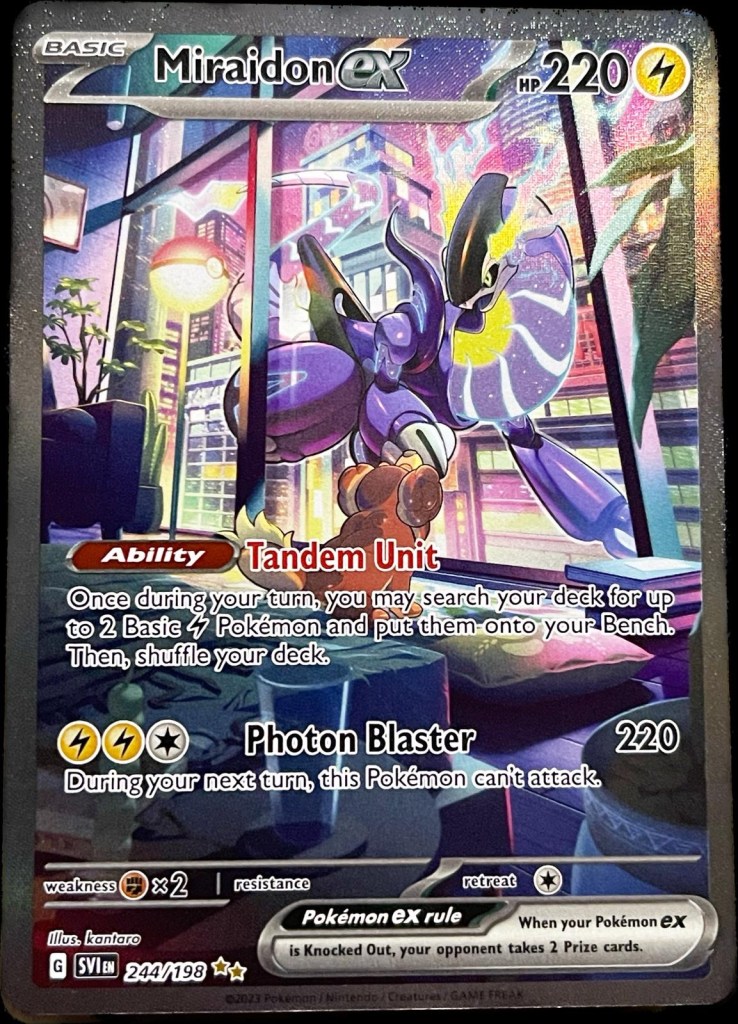 The quality of the art work is sublime. We thought Crown Zenith was good. We didn’t invest too much in that set since it seemed like a rehash of other sets. I had a feeling they would print it into oblivion. Prices did collapse. In this set, we have cards telling stories, Tera Pokémon, new Pokémon, old Pokémon, and Pokémon from the Violet game in a way I haven’t seen while playing. The picture on the lower row in the middle shows a futuristic Miraidon outside with a Fidough inside. Terrific framing. They might print it into oblivion, there’s value in the art. We want more people to enjoy it.