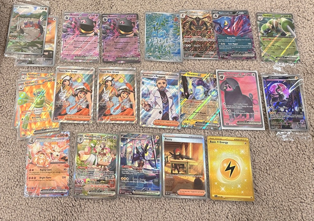 We both love the set. After all those cards, we’re still missing 5 commons. I could do without some uninteresting Pokémon having multiple cards devoted to them. We wouldn’t have noticed if we didn’t organize the set, to see which ones we were missing. I am glad there are no rainbow cards. The silver border is subdued and allows the art to pop. Numerous full art is impressive. Given there are 400 Pokémon in the Scarlet Nintendo game, the ability to expand the trading card game is assured for many years. themandalorian has a goal to buy Nintendo one day and gift herself all the Pokémon packs she wants. 😂