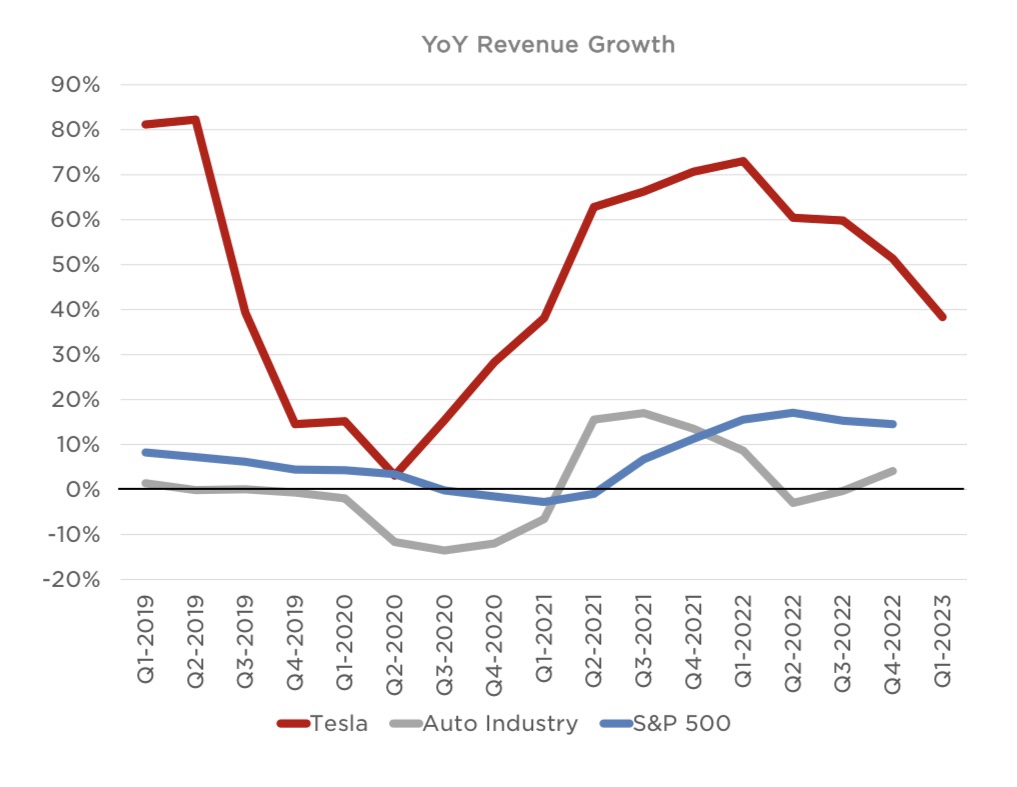 Tesla’s own YoY revenue growth rate chart shows Q1 growing at close to 40%. The actual revenue numbers from page 4 show YoY Total Revenue increased by 24%. The last point in the chart for Q1 2023 should show a deeper dive. We can see growth rates have been slowing down from Q1 2022. The automotive business grew revenue 18% year over year. Growth rates were pulled higher by Services and Energy generation and storage.