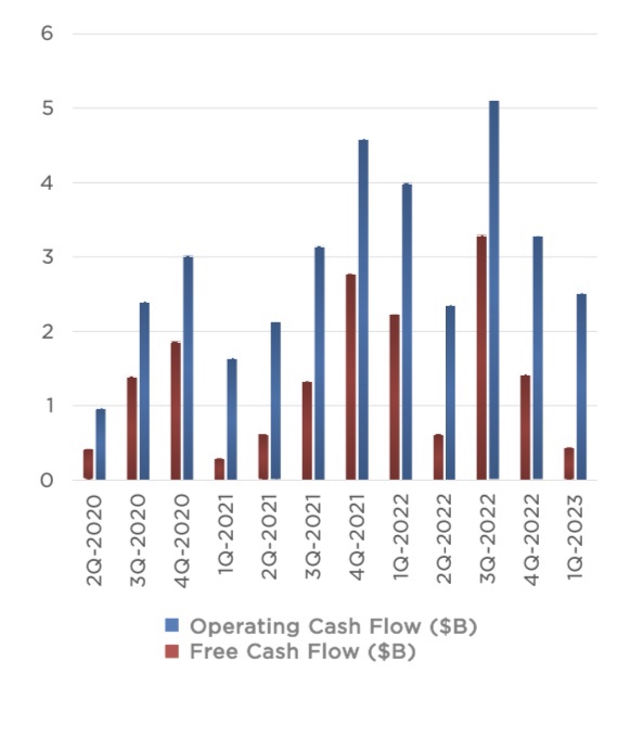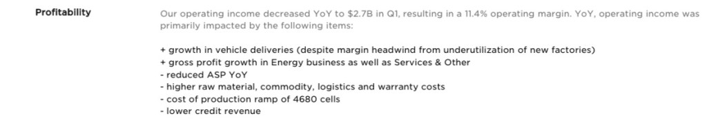 Wait… you might ask how did Tesla’s revenue go up but earnings went down? Great question. From page 4, operating expenses were down 1% YoY, which is impressive for a fast growing company. Page 23 shows Total cost of revenues increased from 13,296 to 18,818 from Q122 to Q123. Total revenues went from 18,756 to 23,329. If you do the math, cost of revenues went up more than revenues. In % terms, cost of revenues went up a greater % than revenues (41.5% vs 24.4%). Which explains why operating margins dropped from Q4.