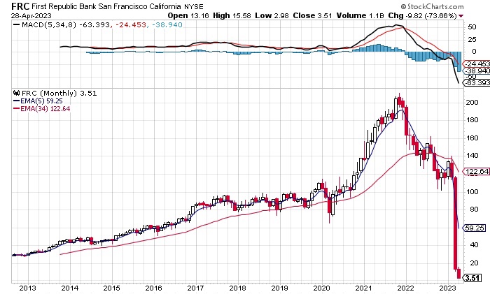 We bought 50 shares of First Republic, after the Silicon Valley Bank disaster. That was mistake #1. We doubled down and bought another 50 shares after earnings, and close to $100 billion in deposits were withdrawn last quarter. It seems likely First Republic Bank won’t exist on Monday morning. The FDIC is looking to seize the bank and sell it quick. It was our thinking that First Republic had good assets, and only needed some equity to stay afloat. Why not buy a good asset for cheap was our thinking? That’s probably the case. Whoever buys it will get First Republic for cheap, reduce competition, and go up the next day.