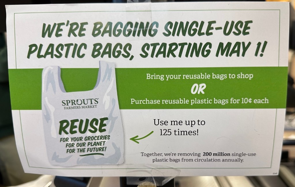 Sprouts Farmers Market has more than 380 grocery stores across the US. As of May 1st, you can no longer get single-use plastic bags in their stores. You can bring your own or buy a reusable plastic bag that will last 125 trips. This single change will save 200 million single-use plastic bags a year. Plastic bags are sourced from fossil fuels. Way to go Sprouts! Now to tackle the other 100 billion single-use plastic bags we use annually.