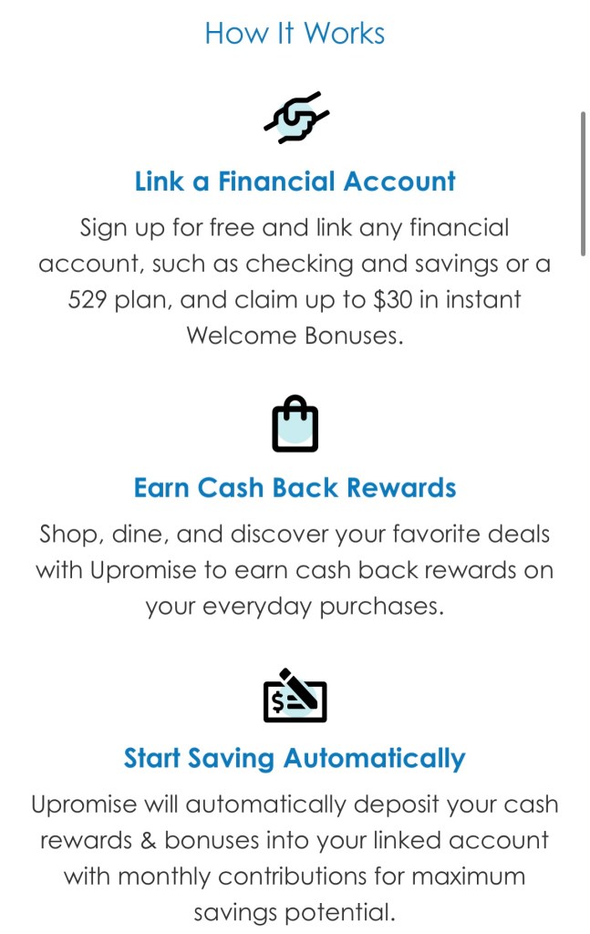 San Francisco pioneered making sure every child has money for college. California soon followed. Instead of having a travel card earning you points or a cash rewards card, Upromise says you can earn rewards via partners and add that to your 529 plan. Upromise is similar to other rewards market places, with various categories such as Entertainment, Finance, Health and Beauty to earn from.