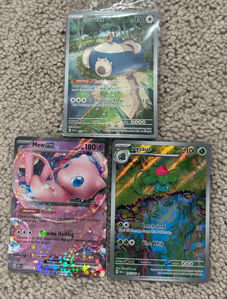 The two best cards we pulled were Mew EX holo and Ivysaur full art. They are valued at $13.29 and $11.78 respectively on pricecharting.com. The Ivysaur may be the card to grade, as it valued at $60 with a 9.5 rating. The Mew EX is only $29 for a 9.5. If we grade these two cards, and they come back as a 9.5, it pays for the entire ETB. I expect the values to go down as more graded cards arrive. How much is the question. The Snorlax promo has fantastic art.