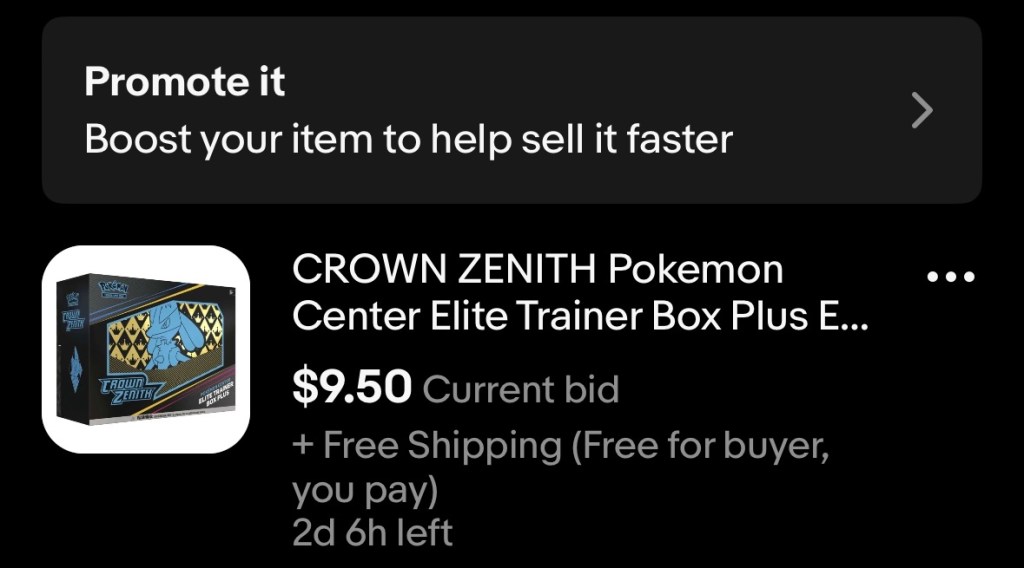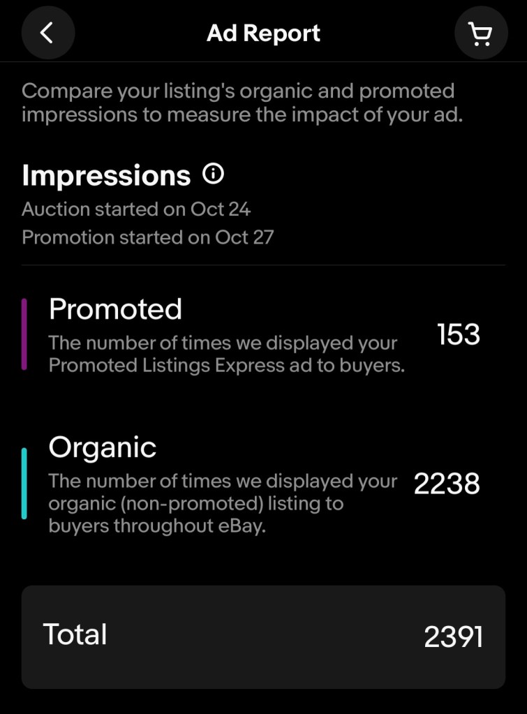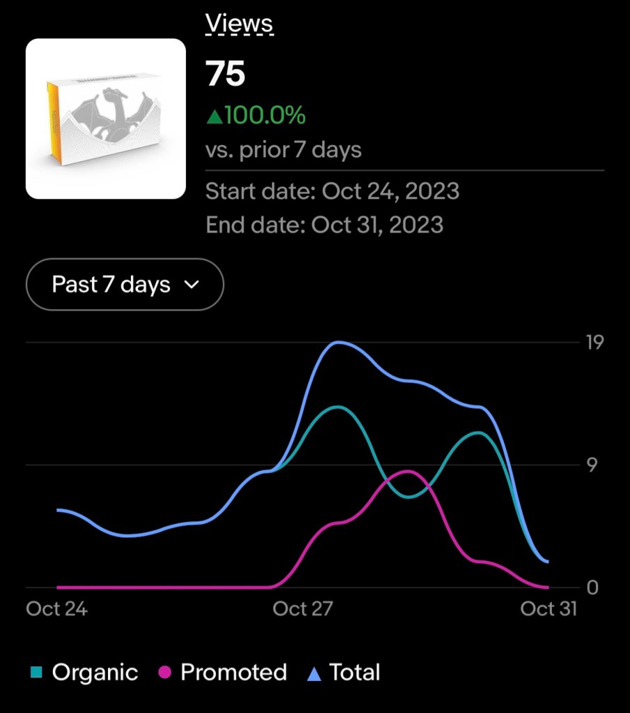 - On our listing above, the promoted views were about 16 of 75, for about a 21% boost. We’re wondering if the boost is worth $2.49 now. Some of our auctions had very few views. Update on 10/31.