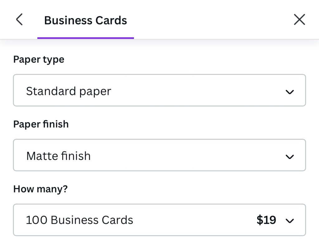 We were happy with our first business card printing with Canva. We were able to buy design elements, upscale the paper quality and have images on both sides. The shipment came in sustainable, recyclable packaging. The price per card reduces slower than Vistaprint as you buy more