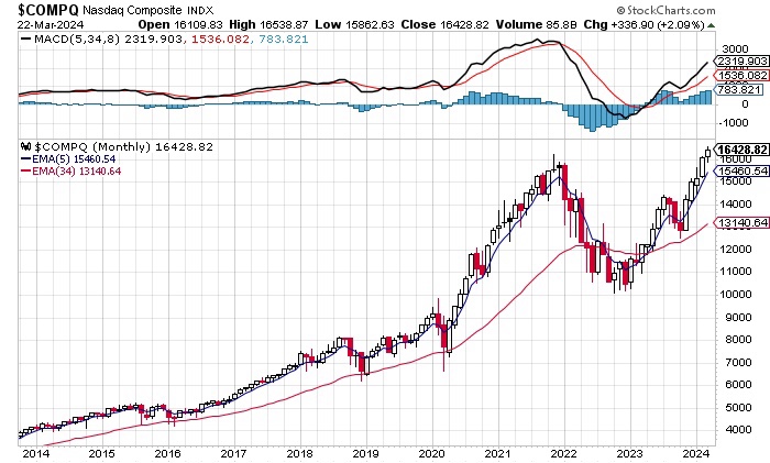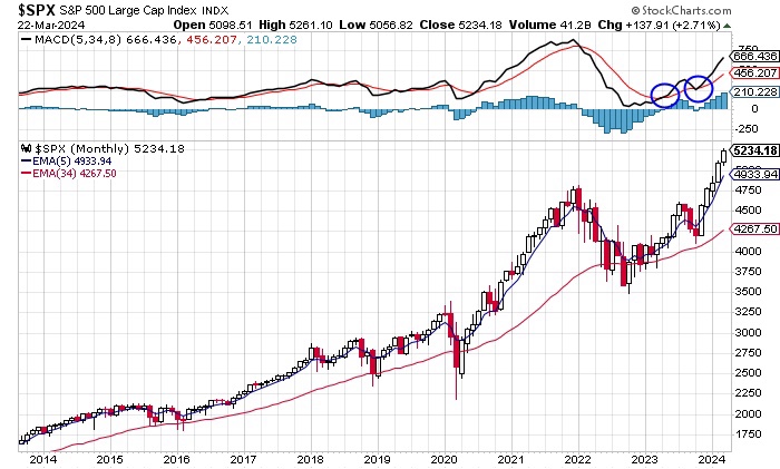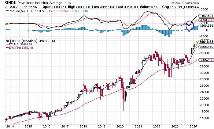 In late 2023, after the Fed raised interest rates numerous times, it looked like the Dow would go below the 34-month exponential moving average. This average provided major support at critical times. The Dow generated a monthly buy signal in 2023 Q4 (top panel, blue ellipse) and has not looked back in 2024 Q1. We are very close to the 40,000 mark, a far cry when we dipped close to 20,000 in 2020. With the Fed poised to lower rates three times this year, the labor market strong, stock markets soaring and inflation rates the Fed watches declining, it’s my belief the Dow will continue to go up in 2024. Trickle down economics and offshoring are no match for bottom up investment in America. If a sell signal is given, we’ll post it here.