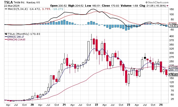 Tesla might be the newest poster child of what happens when a stock breaks its exponential run. The stock went from 20 to 400 in 2 years. A sell signal was given in early 2022 (black line goes below the red). The stock went from 100 to 300 before collapsing to 170 again on declining margins and low growth. Depending on your view, Tesla is consolidating past gains or declining. Tesla reminds me to always have a trailing stop loss so you preserve your gains. Follow a system, make money, sell when the system says it is time to go.