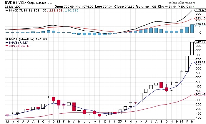 Holy wow. Look at Nvidia. With the buy signal given in early 2023, Nvidia has almost gained 400% in 15 months. I am always worried about the end of exponential runs. For the moment, momentum is strongly higher, on the backs of incredible fundamentals. Kudos to those that owned Nvida shares or options and held on. We sadly sold at $600 after buying at $500. When the next correction comes, and everyone wails that Nvidia’s done, use their pessimism to buy more shares.