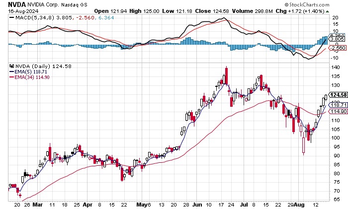 Not all has been rosy with Nvidia’s weekly chart. From June to August, the stock peaked at $140, before moving to $95, and rebounding to $125. A sell signal was given in early July. A new weekly buy signal has not been generated yet. I can tell you numerous times that buying before a buy signal is triggered may lead to the stock declining again and holding losses. Make sure to have a stop loss in place!