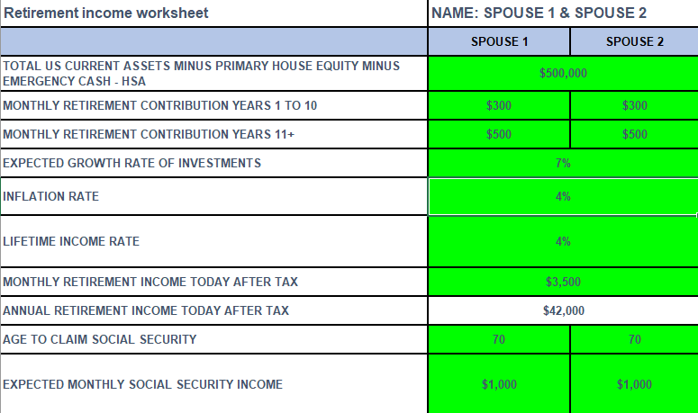 Here’s a visual example, since I hit you with a lot of text. Items in green need to be manually entered. In this example, Spouse 1 is 45, Spouse 2 is 40. They have accumulated 500 thousand in assets, and each are able to save invest $300 per month. After 10 years, they feel they can invest $500 each per month. This is a hypothetical example, it’s not real.
